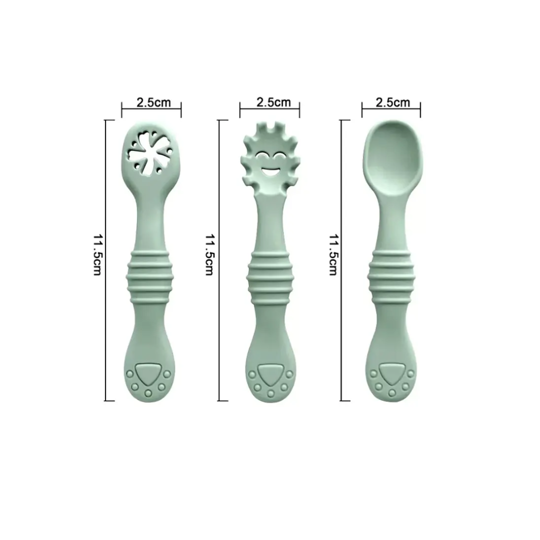Juego de cucharas de alimentación para bebes, ideales para comenzar con la alimentación complementaria al permitir un optimo agarre y son seguros ya que al estar hechos de silicona evita que se dañen con golpes. Están hechos 100% de silicona alimentaria (libre de BPA). Incluye: 3 cucharitas