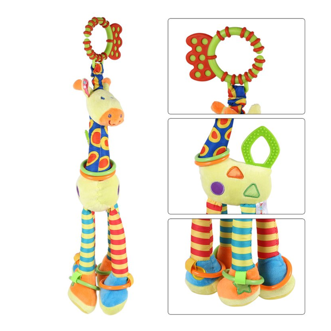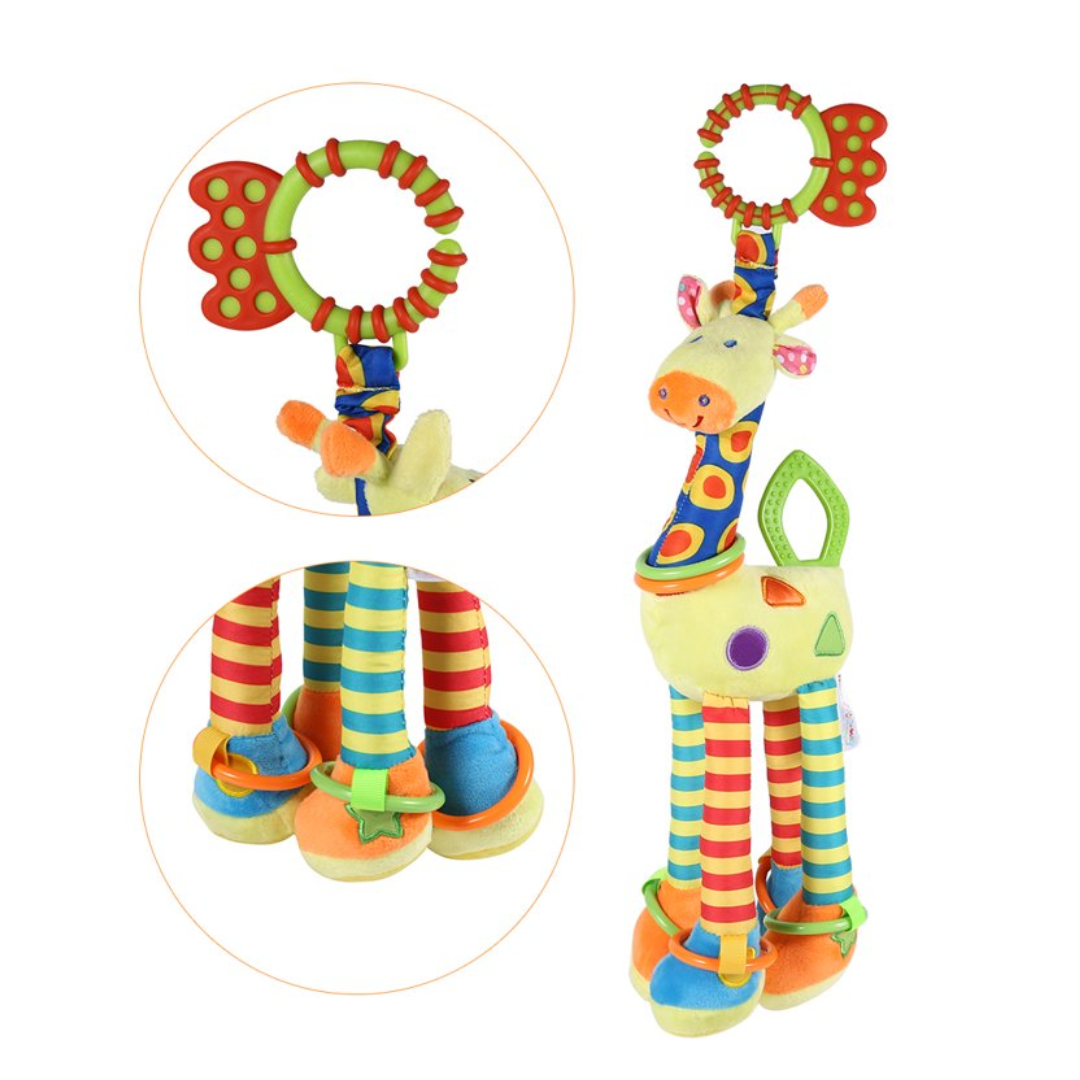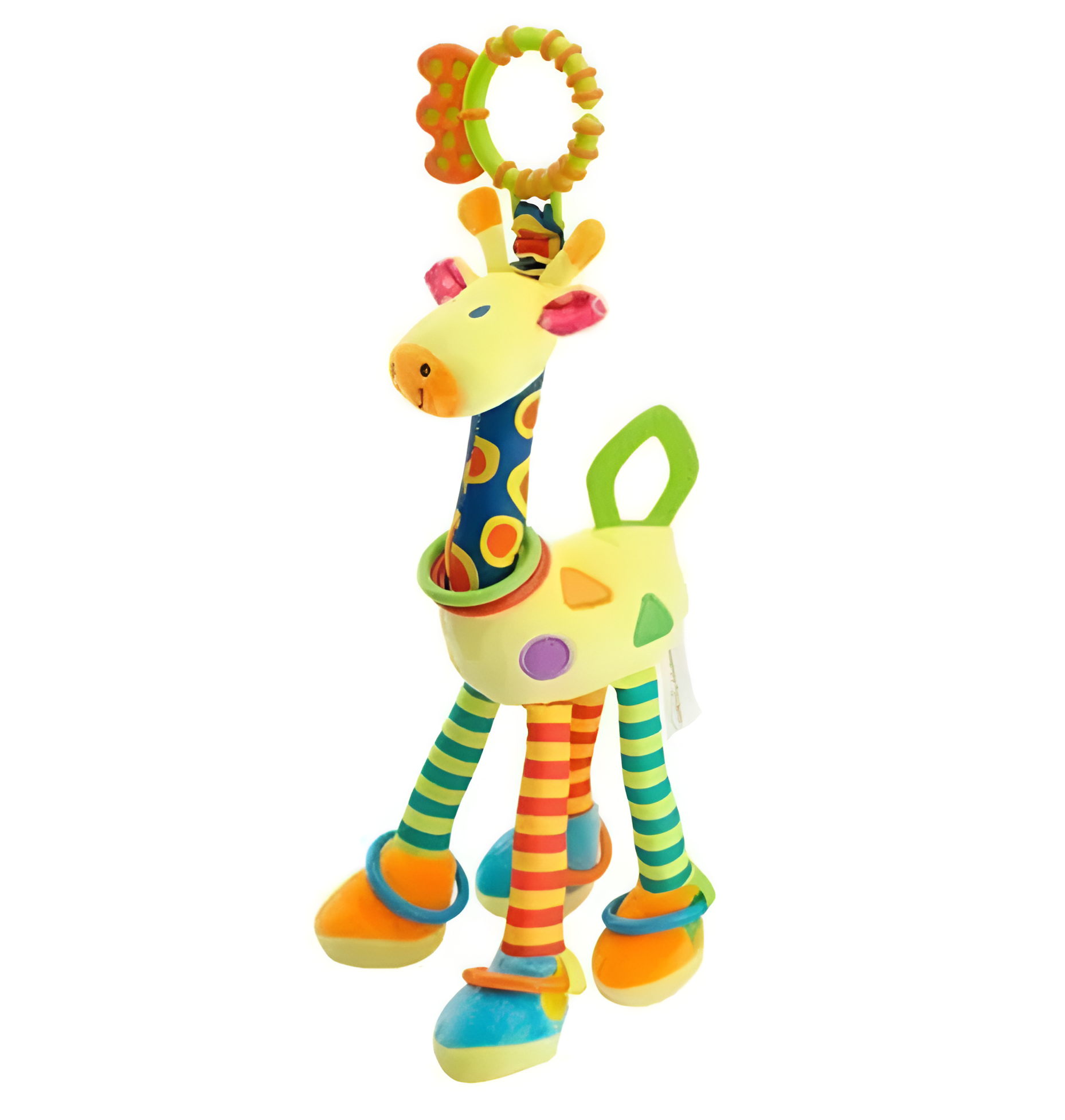 Con una encantadora jirafa de peluche, este sonajero no solo llama la atención por su ternura, sino también por sus colores brillantes, que ayudan a mejorar la capacidad visual del bebé. Las hebillas de colores son perfectas para que las manitos pequeñas practiquen el agarre, mientras que el mordedor ofrece alivio durante la etapa de dentición 🌈🦒💛.
