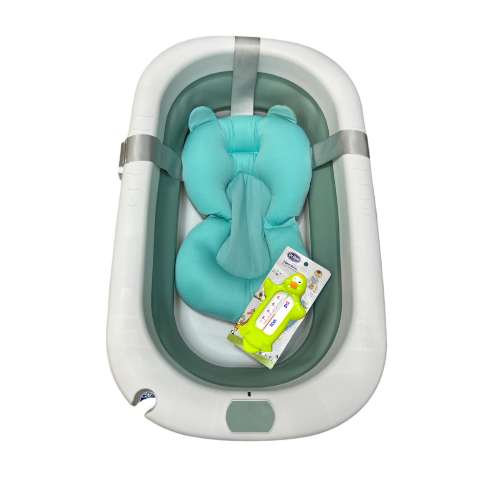 Este Kit Primer Baño es perfecto para hacer que la hora del baño de tu bebé sea una experiencia relajante y divertida. La bañera plegable garantiza su comodidad y seguridad durante el baño, mientras que los accesorios incluidos como 1 hamaca acolchada para tina y 1 termómetro de pez para el agua, hacen que el baño sea aún más placentero.