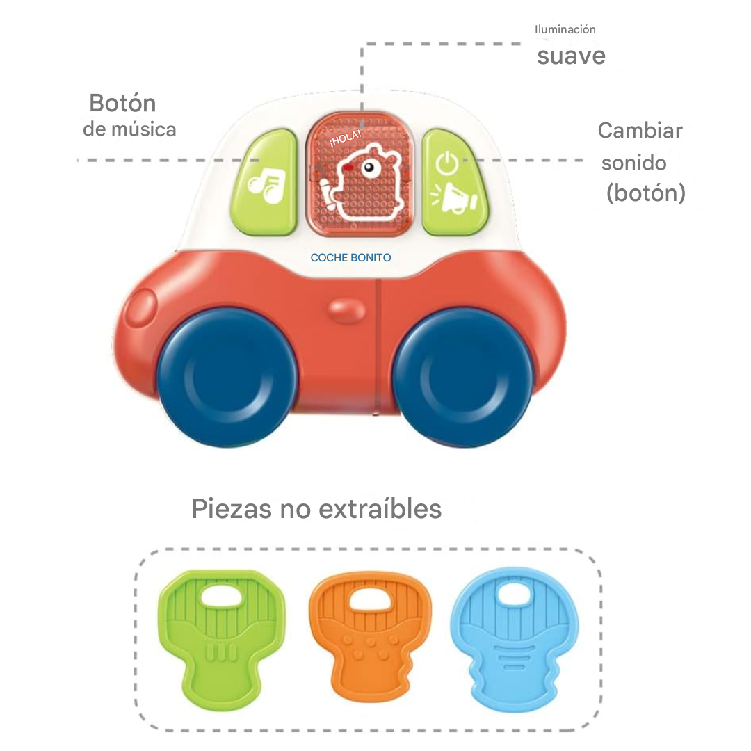Con solo presionar un botón, el mordedor reproduce melodías suaves y relajantes que captan la atención del pequeño, convirtiéndose en el compañero ideal para mantenerlo tranquilo, entretenido y feliz durante cada trayecto.