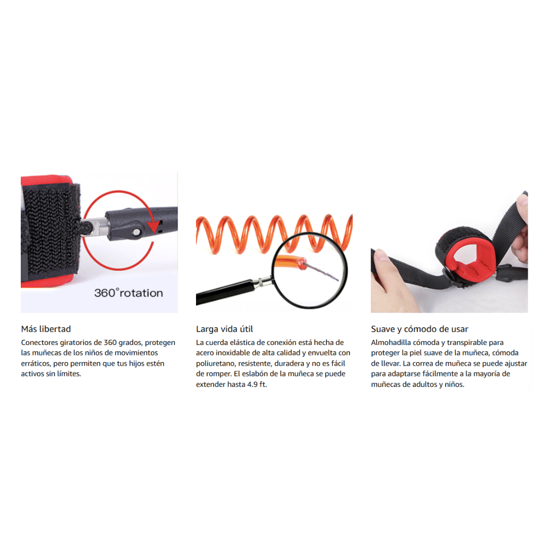 Gracias a su diseño extensible con capacidad de estirarse hasta 1.5 metros, tu hijo puede caminar, explorar y jugar con total comodidad, mientras sigue conectado contigo de forma segura. Su ajuste con velcro y broche en la muñeca garantiza firmeza y estabilidad en todo momento.