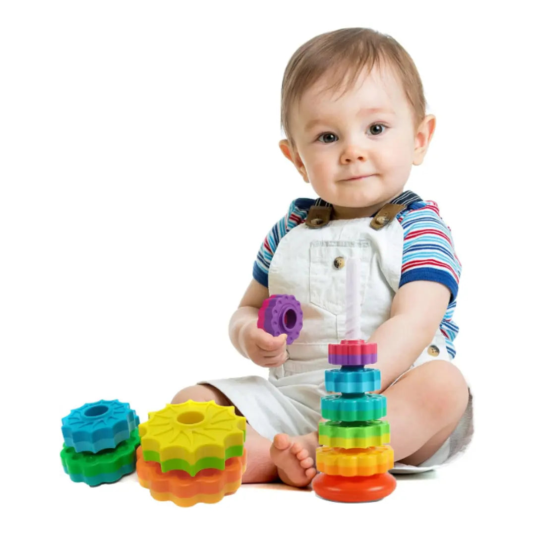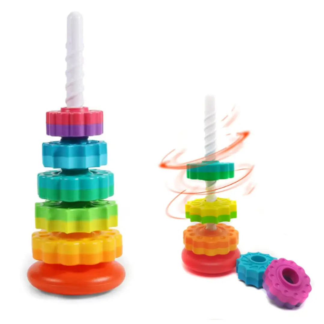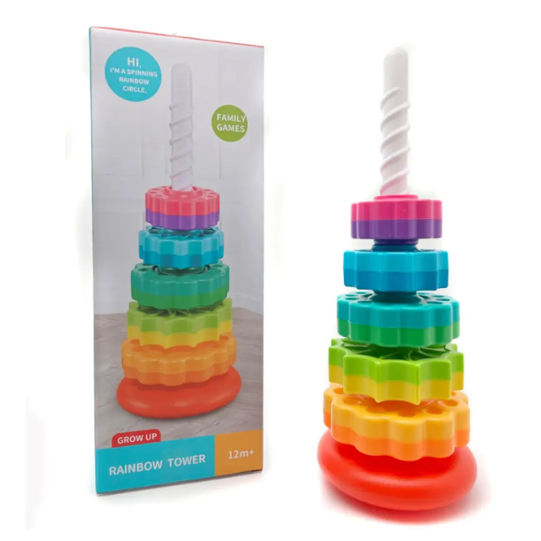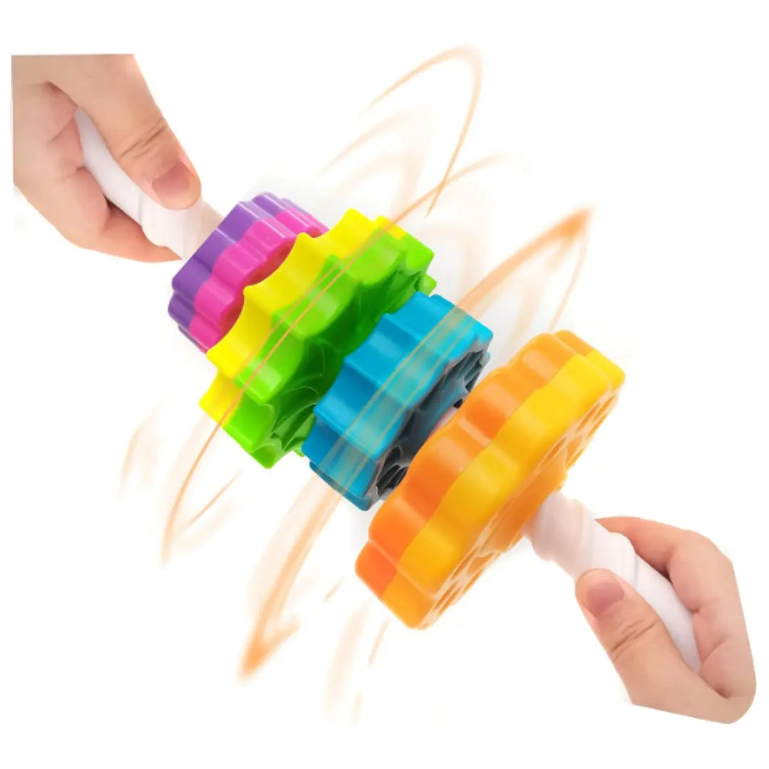 Las vibrantes tonalidades del arcoíris no solo atraen la atención de los niños, sino que también fomentan el desarrollo visual y sensorial a medida que observan los movimientos y colores girar ante sus ojos. Además, el mecanismo de engranajes promueve habilidades motoras finas y la coordinación dándole un giro educativo a la diversión.
