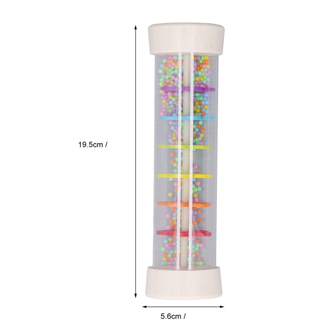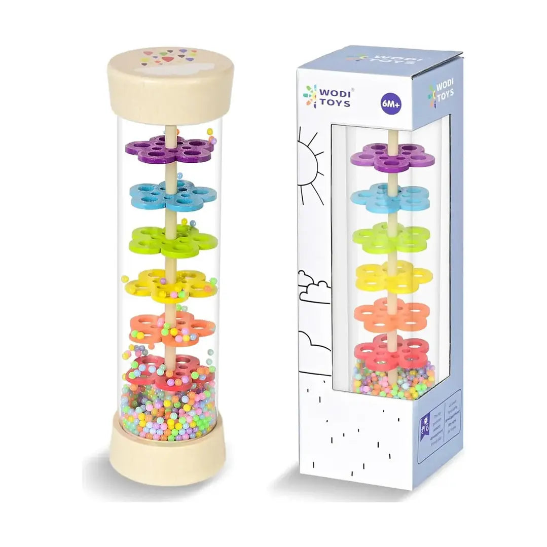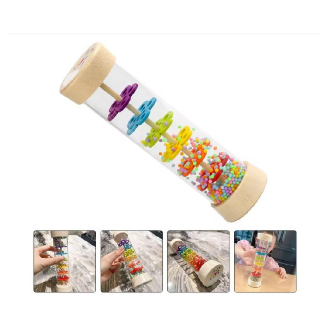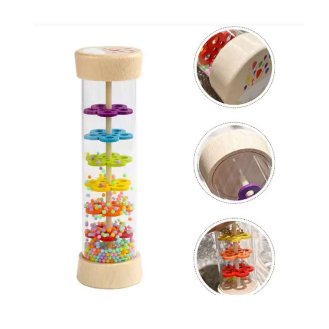 Es un juguete educativo especialmente diseñado para ofrecer una experiencia de estimulación multisensorial única. Al girarla o voltearla, una cascada de pequeñas bolitas desciende suavemente, generando un sonido relajante similar a la lluvia, mientras los colores vibrantes y el movimiento capturan la atención del niño.
